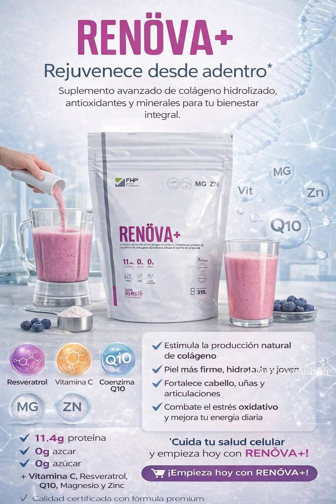 Gracias a sus antioxidantes y nutrientes, el Colágeno Renova también contribuye al bienestar general del cuerpo, ayudando a mantener energía y vitalidad en el día a día.